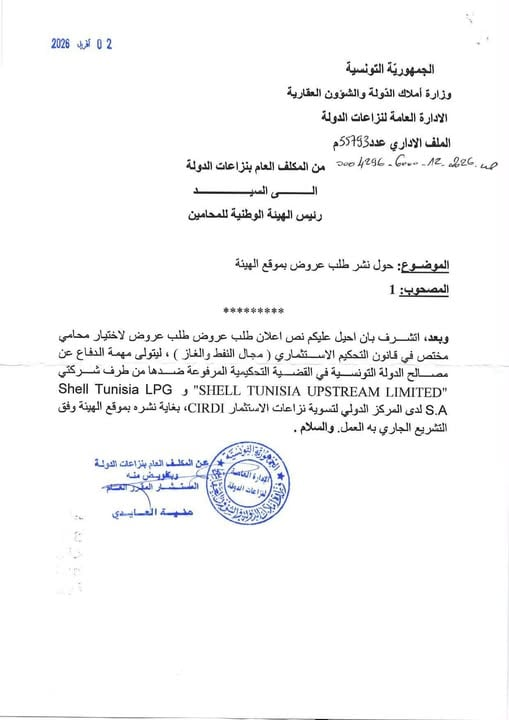 أعلنت الإدارة العامة لنزاعات الدولة بوزارة أملاك الدولة والشؤون العقارية عن شروعها في إجراءات تكليف محامٍ أو مكتب محاماة مختص للترافع والدفاع عن مصالح الدولة التونسية في قضية تحكيم دولي رفعتها شركتا شل تونس للاستكشاف والإنتاج وشل تونس للغاز المسال ضد تونس أمام المركز الدولي لتسوية منازعات الاستثمار.