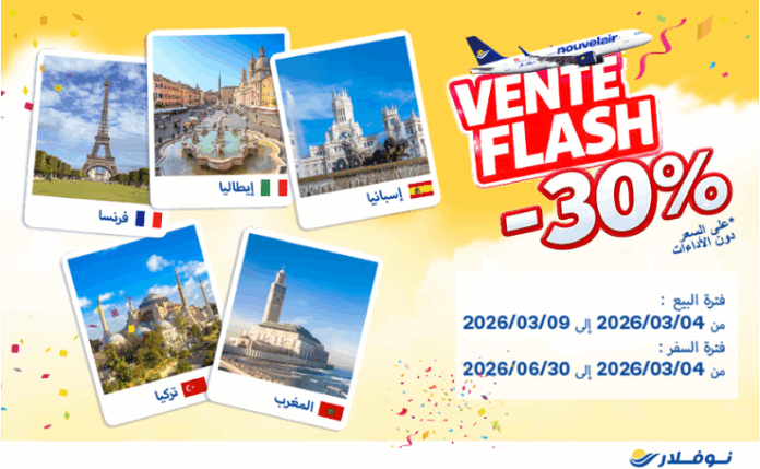 أعلنت نوفلار عن إطلاق عرض «Vente Flash» جديد يمكّن المسافرين من تخفيض بنسبة 30% على سعر التذكرة دون احتساب الأداءات، وذلك نحو فرنسا وإيطاليا وإسبانيا وتركيا والمغرب.
