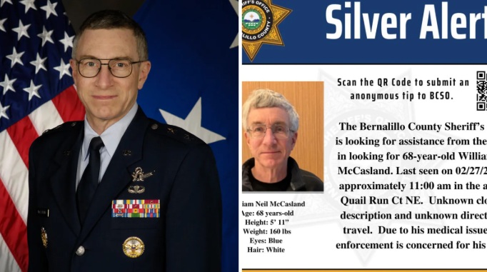 وقال مكتب الشريف إن اللواء المتقاعد في سلاح الجو William Neil McCasland (68 عاماً) غادر منزله في مدينة ألباكارك سيراً على الأقدام حوالي الساعة الحادية عشرة صباحاً يوم 27 فبراير، ومنذ ذلك الحين لم يتواصل مع عائلته أو أصدقائه. كما أوضحت السلطات أن هاتفه المحمول تُرك في المنزل.